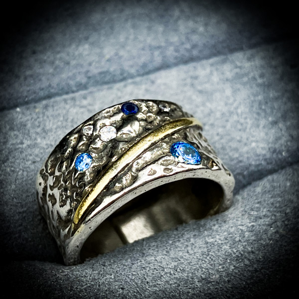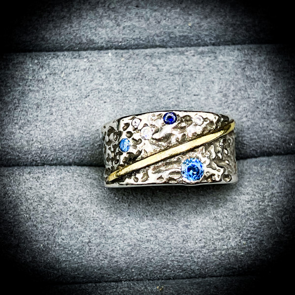 このリングは、夜の底を歩く悪魔ディスが纏う「断絶の力」を具現化した儀式具である。荒々しい質感の銀面には、砕け散った因果の破片が刻まれ、青い魔石は“縁を凍らせる星”として古より恐れられてきた。中央を走る黄金の裂線は、悪縁を分断するために振り下ろされる“断ち切りの刃”の象徴だ。このアイテムが扱うのは、呪殺でも破滅でもない。