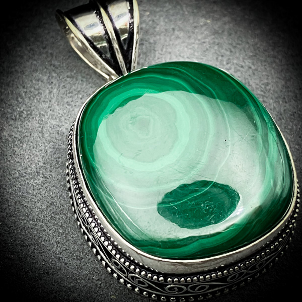 深い緑に浮かぶ、目玉のような渦巻き模様。孔雀の羽を思わせる神秘的な紋様を持つ「マラカイト」は、古来より魔眼の石と呼ばれ、儀式においても重宝されてきた。その渦は、術者の運命を見つめ、正しい方向へと修正する羅針盤でもあるからだ。