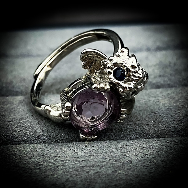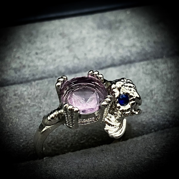 古の魔術師たちは語る「財を守り、富を呼ぶ者は“金獣”である」と。その伝承をかたちにしたのが、このドラコ・アメシストレオン《財獣の覚醒輪》だ。指輪に宿る幼い財獣《レオン》は、まだ小さな姿ながら強烈な魔力を秘めている。胸元で抱え込む紫水晶は“変転の核”と呼ばれ、持主の停滞した金流・運の淀み・敗北続きの流れを別の未来線へとゆっくり押し戻す役割を担う。レオンが目覚めるとき、持主の中に眠る「まだ発揮されていない成功の才能」「封じ込められていた勝負勘」「金を惹きつける魂質」が順次呼び起こされてゆく。