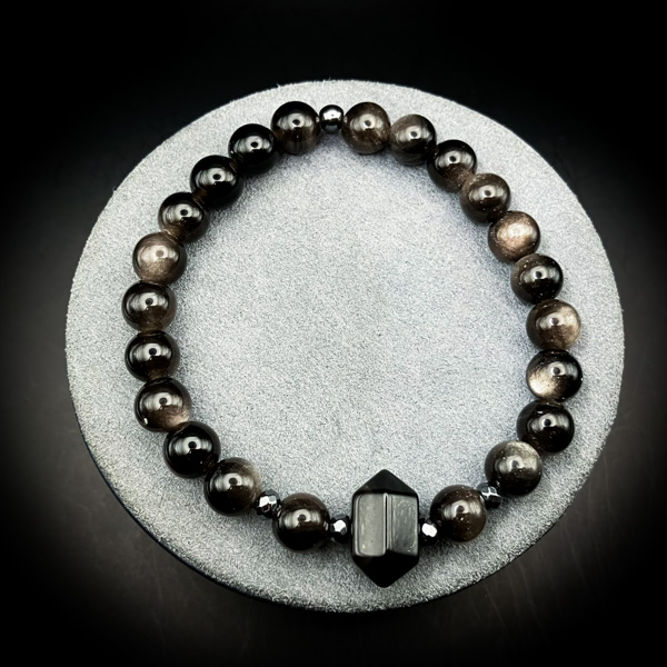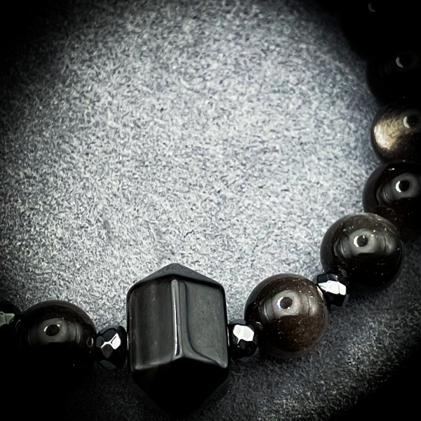 どこまでも深い黒に、黄金の閃光が走る「ゴールデンオブシディアン」。黒曜石特有の強力な防御波動に、内包された金色の光沢が宇宙的エネルギーの架け橋として浮かび上がる、選ばれし守護石だ。