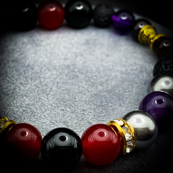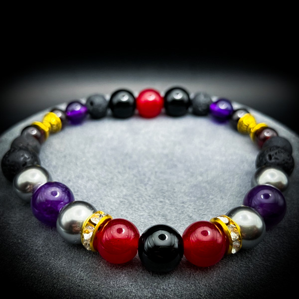 このブレスレットに組み込まれた魔石たちは、すべてが役割を持つ。「アメジスト」は願いの純度を高める。「インカローズ」は感情を魔力へ投影し、欲望を推進力へと変える。「溶岩石」は大地のエネルギーを味方に、現実への干渉力を強化する。「オニキス」は外敵を遮断し、術者の領域を守護する。そして「シルバーパール」は、全ての力を繋ぎ合わせ循環させる。そこに潜む「名も無き石」は、古の時代、高位魔を呼び寄せ、味方として従わせる為にのみ用いられた秘匿の魔石。その正体は既に失われているが、確かに言えるのは、この石が「異質な存在を味方へと転じさせる」という事実だ。敵であったはずのもの、負の感情、他者の悪意ですら、彼の指揮のもと、術者の利益へと改変される。